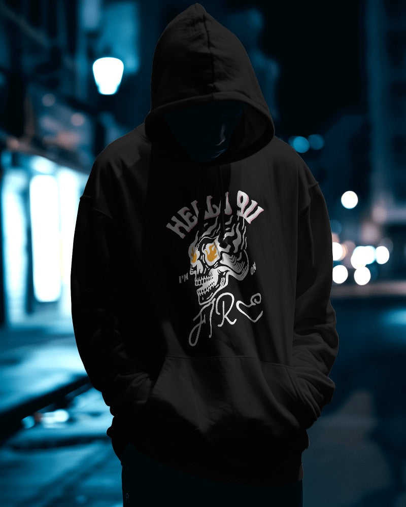 Unleash your inner fire with the Evo Vogue "Hell Yeah I'm On Fire" 450 GSM Heavyweight Hoodie. This statement piece features a fierce and eye-catching skull graphic engulfed in flames, with the bold phrase "Hell Yeah I'm On Fire", making it the ultimate hoodie for those who want to showcase their daring attitude.