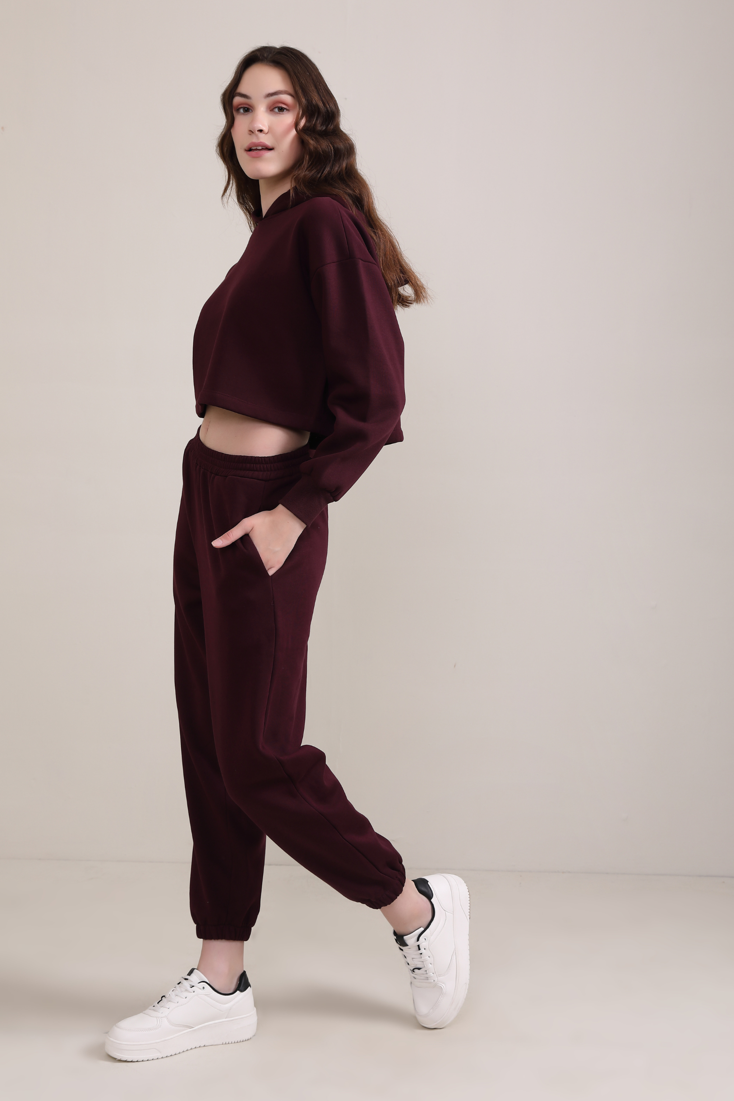 Turn heads with Evo Vogue's Maroon Crop Hoodie, the perfect blend of elegance and comfort.