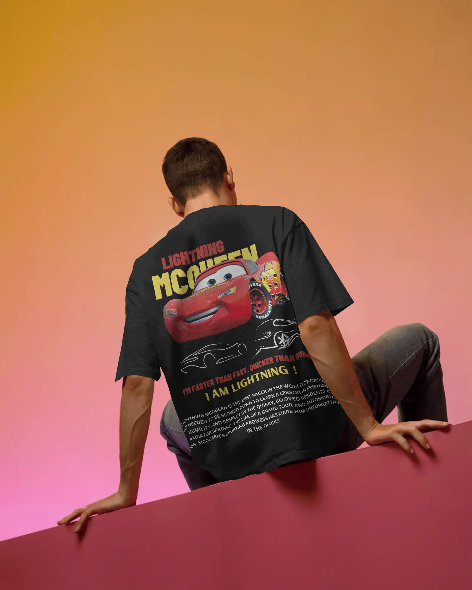 Featuring Lightning McQueen—the beloved racer known for being “faster than fast, quicker than quick”—this tee is a nod to all things speed and style. The bold artwork on the back captures the spirit of the race track, making it perfect for fans of Cars, streetwear enthusiasts, or anyone who loves a dynamic, head-turning design.