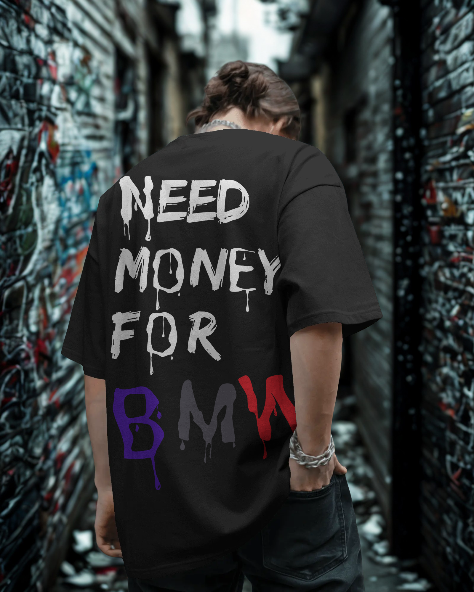 Built for the bold. The Need Money for BMW Oversized T-Shirt is your unapologetic streetwear flex — made to express ambition, hustle, and high-performance dreams. Featuring a graffiti-dripped slogan on the back with standout "BMW" typography in purple, grey, and red, this tee makes no compromises in attitude or luxury.