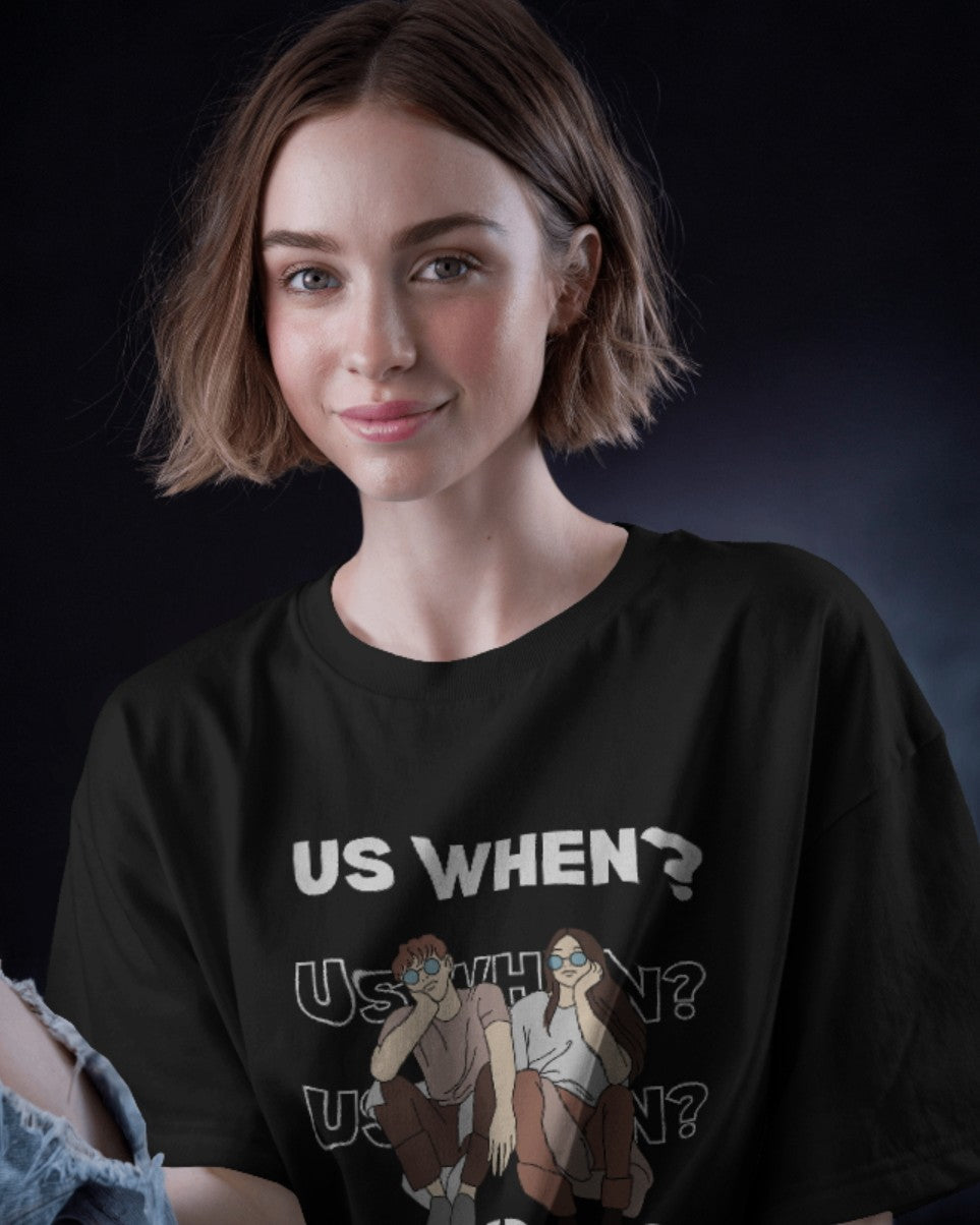 Express your romantic side with the "Us When?" Oversized T-Shirt from Evo Vogue's "Love" Collection. Perfect for couples or anyone who believes in the magic of love, this tee features a charming illustration of a couple seated together, surrounded by the playful yet heartfelt question, "Us When?"